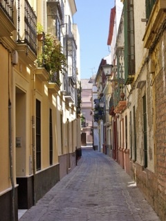 Set in the historic centre of Seville, this light and airy top-floor apartment of 60 m2 is located one block from the Fine Arts Museum and a 15-minute amble through the downtown pedestrian shopping area to the Cathedral. It is three blocks from the river and its pretty walks to Triana and the restored monastery of La Cartuja, now the Contemporary Art Museum. It has one double bedroom with queen-sized bed, spacious kitchen/dining room, full bathroom, sitting room with picture window giving onto plant-filled terrace which overlooks church and small square. From a higher level terrace (short metal ladder access) you can see over the roof tops to the Cathedral. (Please note: a lift is being installed early in 2024.) Each room has a ceiling fan and there is air-conditioning and WIFI internet access. Available all year including